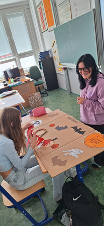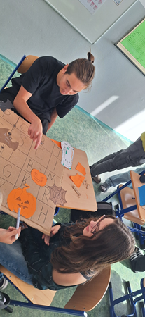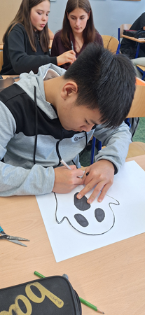 Žáci 9. A finišují s výrobou originálních rekvizit a dekorací na projektový den Halloween. Vše připravujeme pro žáky 1. stupně, na které se v pátek 31. října těšíme. Naše malé spolužáky čeká halloweenská abeceda, strašidelná překážková dráha, florbal s příšerami, diskotéka a mnoho dalšího. IS + 9.A