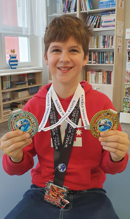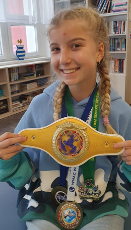 Víte o tom, že máme ve škole přeborníky v boji v kleci? Byl jsem v úžasu, když se dnes do ředitelny dostavili šampioni, kteří si ze Světového poháru v bojovém umění dovezli pěknou sbírku cenných kovů. Beata ze 7. ročníku v boji v kleci dosáhla na zlato a v dalších disciplínách získala 3. a 5. místo. Patricie v boji v kleci skončila bronzová a jinak si dovezla 1 zlato a 2 stříbrné medaile. Simon v boji v kleci získal stříbrnou medaili a dál obsadil 1. a 2. místo. Gratulujeme!