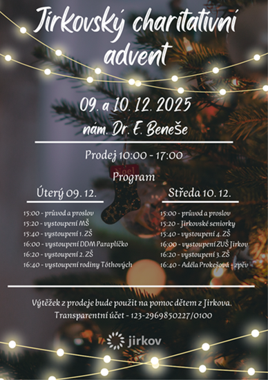 Srdečně vás zveme na Jirkovský charitativní advent, který se uskuteční na náměstí Dr. Edvarda Beneše ve dnech 9. a 10. prosince. Letos se do akce opět zapojí naši žáci, kteří budou prodávat školní výrobky a dobrůtky. Na pódiu vystoupí žáci 1.A s paní učitelkou Šárkou Laurencovou a také školní sbor paní učitelky Andrey Fricové. Začátek dnes v 16:20. Výtěžek z akce poputuje na charitativní účely místním dětem. Pojďme si užít vánoční atmosféru v netradičním jarním počasí. Moc se na vás těšíme. IS