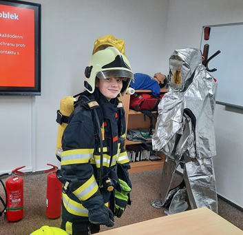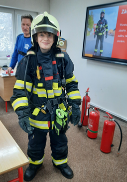 V listopadu navštívili žáci šestých, sedmých a osmých ročníků v rámci preventivního programu hasiče v Jirkově. Sedmáci si povídali například o evakuaci, základech první pomoci a ochraně obyvatelstva, osmáci se seznámili s principy vzniku a hašení požáru, používání hasicích přístrojů, jak se zachovat při dopravní nehodě, žáci 6. ročníku si prakticky vyzkoušeli volání na tísňovou linku, seznámili se se složkami IZS a povídali si o mimořádných událostech. Na přiložené fotografii je žák 8. ročníku v hasičské uniformě. Hasičům děkujeme za zajímavé besedy. LH
