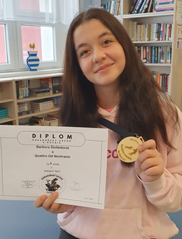 Dnes jsem ve škole potkal Simona ze 7. ročníku a Patricii z 9. třídy a dozvěděl jsem se, že byli velice úspěšní na republikové soutěži SAMURAj CUP. Patrik a Patricie v disciplíně "boj na zemi" udolali svého sportovního protivníka natolik, že Simon získal stříbrnou medaili a Patricie zlatou a bronzovou. Oběma našim studentům gratuluji. Pokud k té samurajské chrabrosti připojíte samurajskou čest, nepochybuji, že v budoucnu nezvládnete možné potíže. Jste dobří!