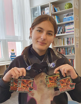 Víte o tom, že máme ve škole přeborníky v boji v kleci? Byl jsem v úžasu, když se dnes do ředitelny dostavili šampioni, kteří si ze Světového poháru v bojovém umění dovezli pěknou sbírku cenných kovů. Beata ze 7. ročníku v boji v kleci dosáhla na zlato a v dalších disciplínách získala 3. a 5. místo. Patricie v boji v kleci skončila bronzová a jinak si dovezla 1 zlato a 2 stříbrné medaile. Simon v boji v kleci získal stříbrnou medaili a dál obsadil 1. a 2. místo. Gratulujeme!