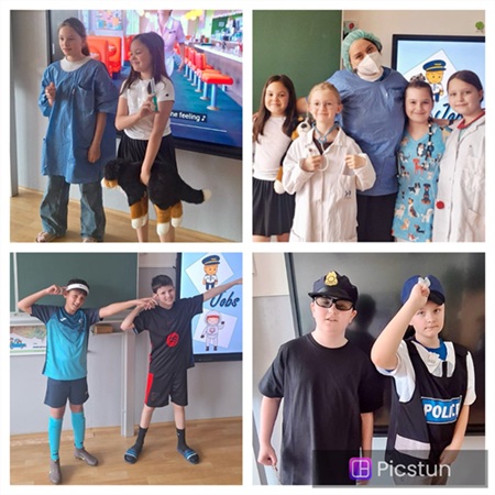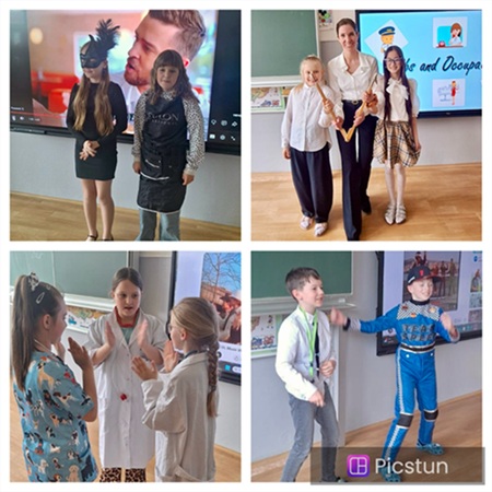 Víte, čím chtějí být naši čtvrťáci, až vyrostou? My už ano! Minulý týden se celá 4. B proměnila v neuvěřitelnou směsici profesí. Na chodbách jste mohli potkat herečky, zpěvačky, policisty, kadeřnice a mnoho dalších povolání. Nebyl to ale jen obyčejný karneval. Celá hodina angličtiny se nesla v duchu tématu „My Future Job“. Děti v kostýmech nejen skvěle vypadaly, ale také se v angličtině mnohé naučily. Hádaly povolání každého spolužáka podle indicií a gest, obohatily svou slovní zásobu o další nová slovíčka, zahrály si nejrůznější hry. Všechno samozřejmě v anglickém jazyce. Celý program zakončily společnou diskotékou. Rozdělily se do skupin podle svých profesí a jejich úkolem bylo připravit si krátké taneční vystoupení, kdy každá skupina do své choreografie zakomponovala pohyby, které jejich budoucí povolání charakterizovaly. Mohli jste tak vidět dynamické výkopy profesionálních fotbalistů, nekompromisní taneční nástup policistů nebo synchronizovanou “první pomoc” zdravotních sester a doktorek. LD + IS