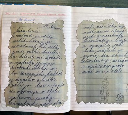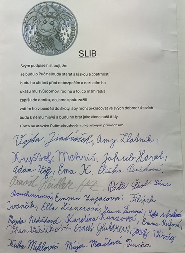 Od jarních prázdnin máme ve třídě nového originálního člena – mluvícího Pučmelouda. Přistál u nás prý omylem, ale protože se mu u nás ve třídě líbí a oceňuje náš smysl pro humor, rozhodl se zůstat. A my jsme za to rádi, protože s ním začala nová tradice, která nás všechny baví. Pučmeloud by chtěl poznat život každého z nás, proto jsme zavedli týdenní losování, při kterém se určí, u koho stráví následující víkend. Šťastlivec si ho odnese domů v pátek a v pondělí nám vypráví, co všechno spolu zažili. Někdo ho bere na výlet, někdo mu ukáže domácí mazlíčky a někdo mu třeba uplete nový náramek. Pučmeloud tvrdí, že mu vyhovuje všechno. Kromě zábavy má Pučmeloud i důležitou funkci. Stal se naším víkendovým off-line šéfem. To znamená, že dohlíží na to, aby se během víkendu nepřehánělo používání mobilů. Nezakazuje je úplně, ale připomíná, že svět je zajímavý i tak. Podle jeho vlastních slov: "Když koukáš pořád do mobilu, nevidíš ani včelu, natož Pučmelouda!" JK, 4.B