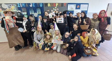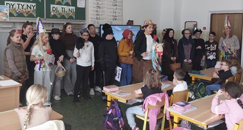 Aby si masopustní veselí užily i ostatní třídy, rozhodla se 5. B uspořádat průvod po škole. Navštívili jsme děti na prvním stupni. V našem doprovodu nesměly chybět tradiční masky – Laufři, medvědi s medvědáři, kominíci, koně i “babky”. Mladší spolužáci se od páťáků dozvěděli zajímavosti o lidových zvycích, poslechli si typickou říkanku i píseň a stali se tak součástí pravého masopustního veselí. A aby si páťáci ověřili pozornost svých posluchačů, připravili si pro ně v závěru malý kvíz. Za správné odpovědi rozdávaly „babky“ malé odměny. LD