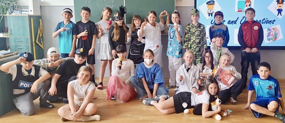 Víte, čím chtějí být naši čtvrťáci, až vyrostou? My už ano! Minulý týden se celá 4. B proměnila v neuvěřitelnou směsici profesí. Na chodbách jste mohli potkat herečky, zpěvačky, policisty, kadeřnice a mnoho dalších povolání. Nebyl to ale jen obyčejný karneval. Celá hodina angličtiny se nesla v duchu tématu „My Future Job“. Děti v kostýmech nejen skvěle vypadaly, ale také se v angličtině mnohé naučily. Hádaly povolání každého spolužáka podle indicií a gest, obohatily svou slovní zásobu o další nová slovíčka, zahrály si nejrůznější hry. Všechno samozřejmě v anglickém jazyce. Celý program zakončily společnou diskotékou. Rozdělily se do skupin podle svých profesí a jejich úkolem bylo připravit si krátké taneční vystoupení, kdy každá skupina do své choreografie zakomponovala pohyby, které jejich budoucí povolání charakterizovaly. Mohli jste tak vidět dynamické výkopy profesionálních fotbalistů, nekompromisní taneční nástup policistů nebo synchronizovanou “první pomoc” zdravotních sester a doktorek. LD + IS