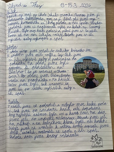 Od jarních prázdnin máme ve třídě nového originálního člena – mluvícího Pučmelouda. Přistál u nás prý omylem, ale protože se mu u nás ve třídě líbí a oceňuje náš smysl pro humor, rozhodl se zůstat. A my jsme za to rádi, protože s ním začala nová tradice, která nás všechny baví. Pučmeloud by chtěl poznat život každého z nás, proto jsme zavedli týdenní losování, při kterém se určí, u koho stráví následující víkend. Šťastlivec si ho odnese domů v pátek a v pondělí nám vypráví, co všechno spolu zažili. Někdo ho bere na výlet, někdo mu ukáže domácí mazlíčky a někdo mu třeba uplete nový náramek. Pučmeloud tvrdí, že mu vyhovuje všechno. Kromě zábavy má Pučmeloud i důležitou funkci. Stal se naším víkendovým off-line šéfem. To znamená, že dohlíží na to, aby se během víkendu nepřehánělo používání mobilů. Nezakazuje je úplně, ale připomíná, že svět je zajímavý i tak. Podle jeho vlastních slov: "Když koukáš pořád do mobilu, nevidíš ani včelu, natož Pučmelouda!" JK, 4.B